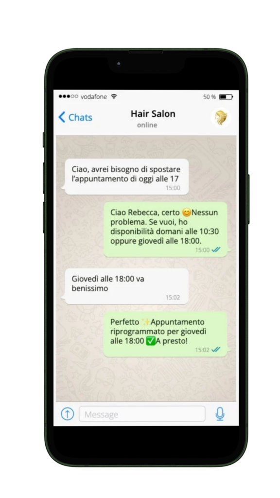 Consente ai clienti di modificare cancellare un appuntamento direttamente su WhatsApp, sincronizzando la tua agenda.