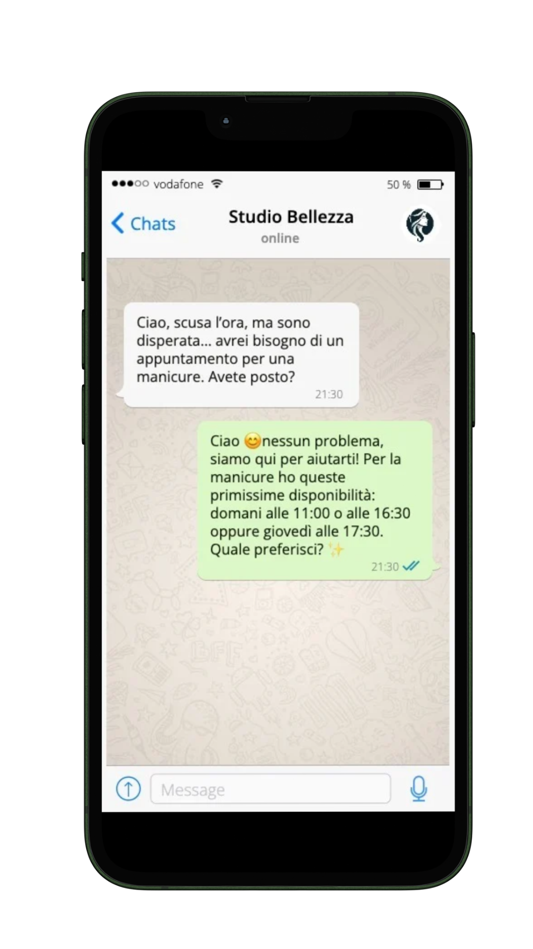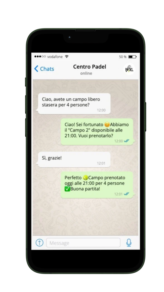 Dalla chat alla prenotazione in pochi secondi. Inserisce automaticamente gli appuntamenti nella tua agenda senza necessità di intervento umano e riducendo il rischio di sovrapposizioni